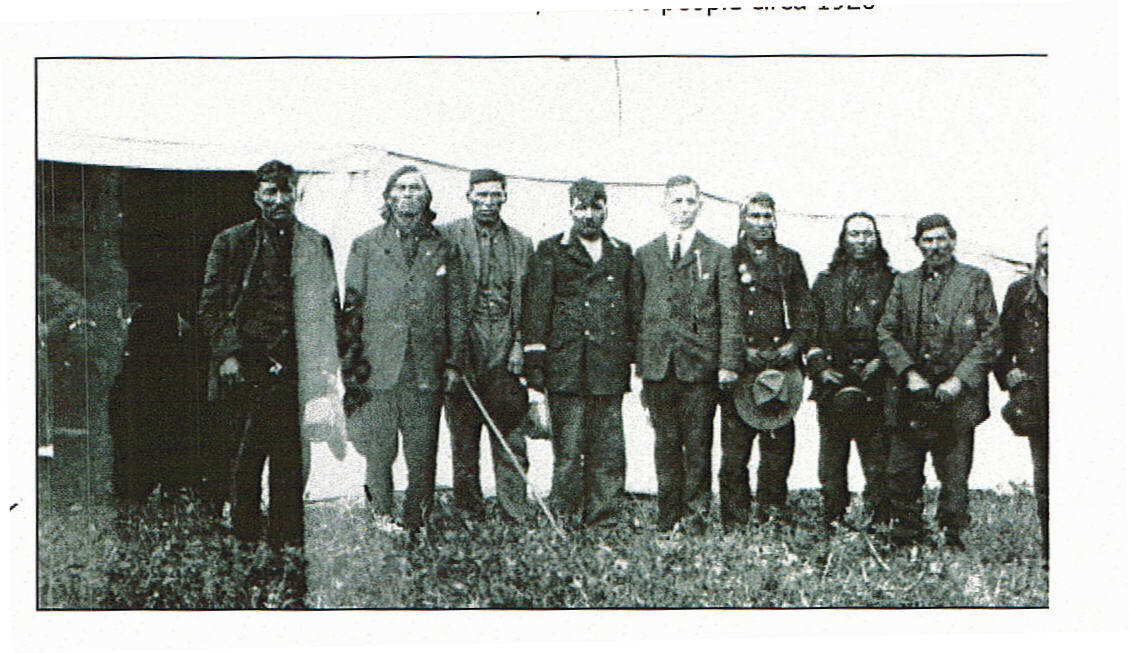 The first meeting of the League of Indian Nations held in western Canada, hosted by the Keeseekoowenin/Okanase people circa 1920.