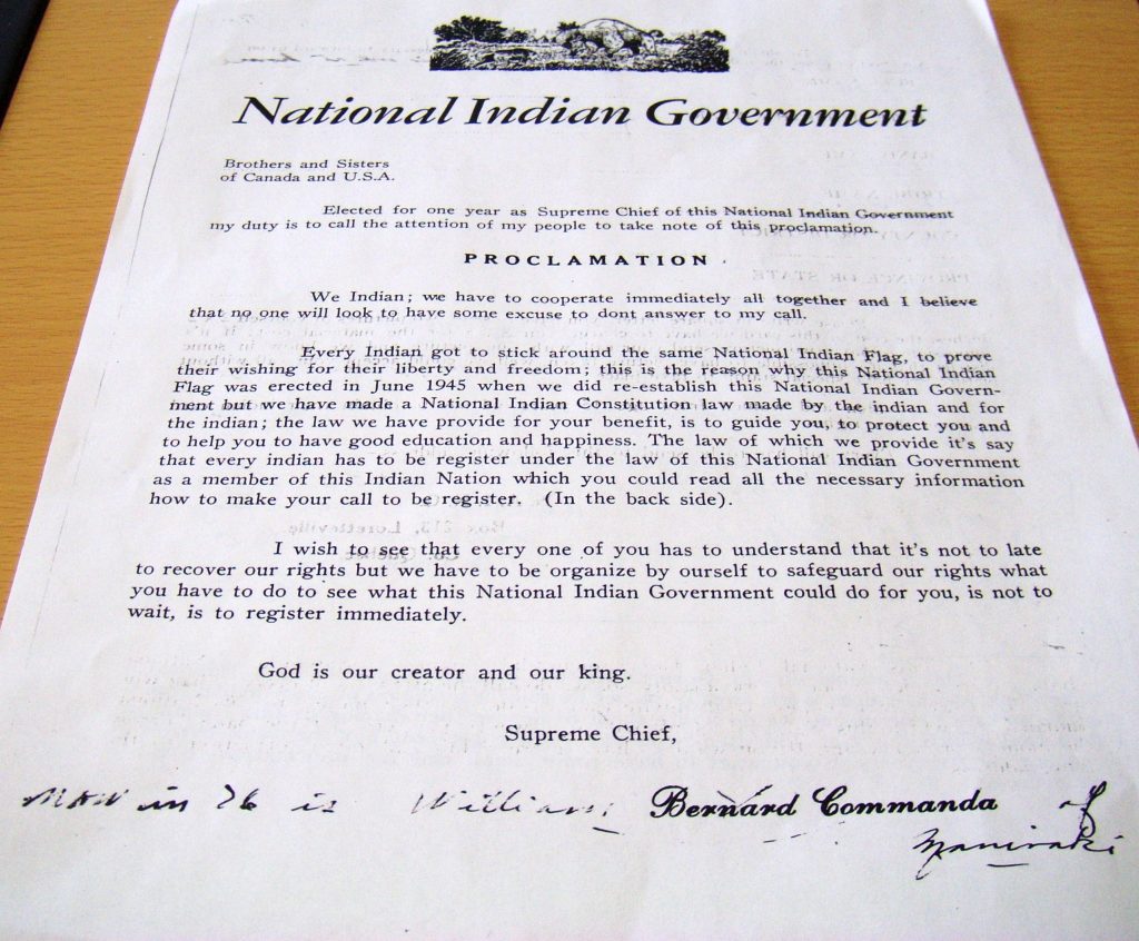 7. The Authorities of the League of Indian Nations of North America shall be guarantors of the integral respect of the legal rights. They shall have the power to negotiate with His Majesty’s government, at Ottawa, in regards to the natural resources in so far as the interests of the Indian Nations are concerned.