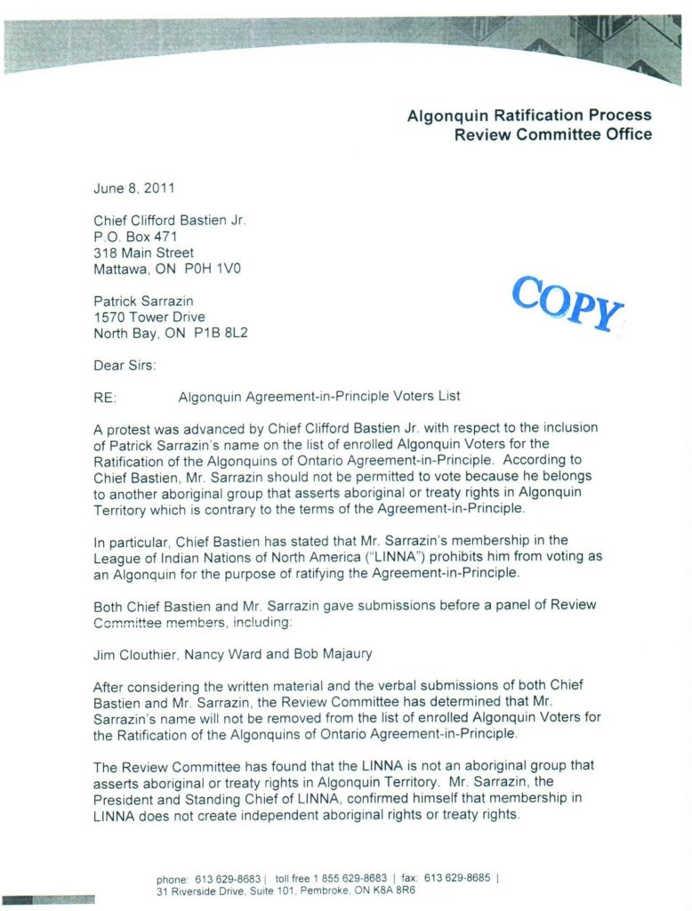 I never did say in the last conversation with him that LINNA.ca was in good standing with LINNA-USA.org. So why would he have those that are working with him send out an email misleading all of you that they were in good standing with LINNA.ca? As Grand Chief,