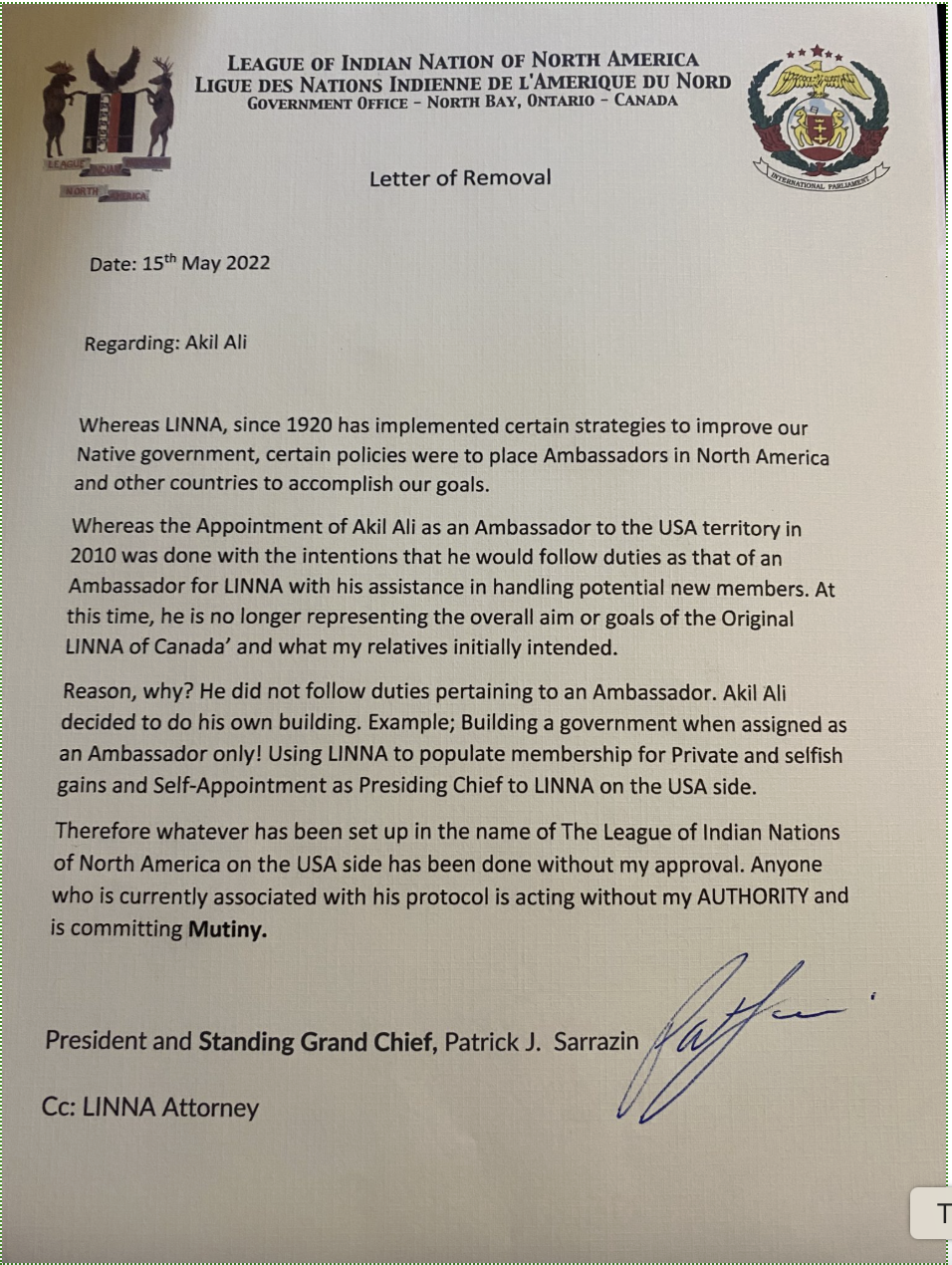 I, DR. Patrick Sarrazin, the Standing Grand Chief of the original and Official Government house of LINNA.ca, would like to take this time to officially address all of you from a sincere heart especially in light of the recent events that have occurred on the USA side.  As of 15th May 2022, I have removed Ambassador Akil Ali from his duties as an Ambassador of the official government house of LINNA.ca. My concern with former Ambassador Akil Ali was pertaining to the mistrust of a conversation we had back in February 2022.